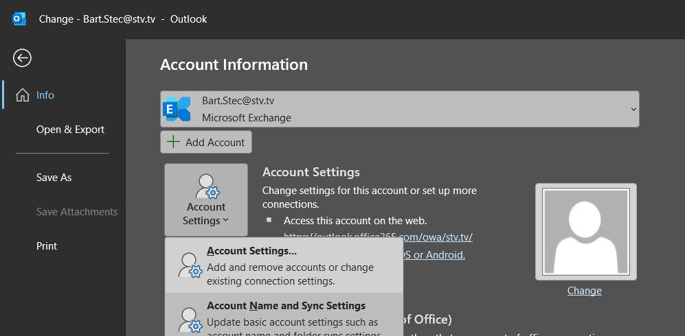 From the main Outlook window, click File then Account Settings > Account Settings...