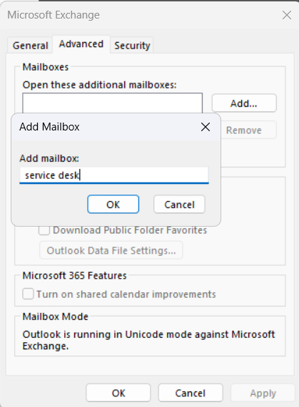 In the dialog box, please type the name of the mailbox you wish to add - In this example I have used the Service Desk Mailbox